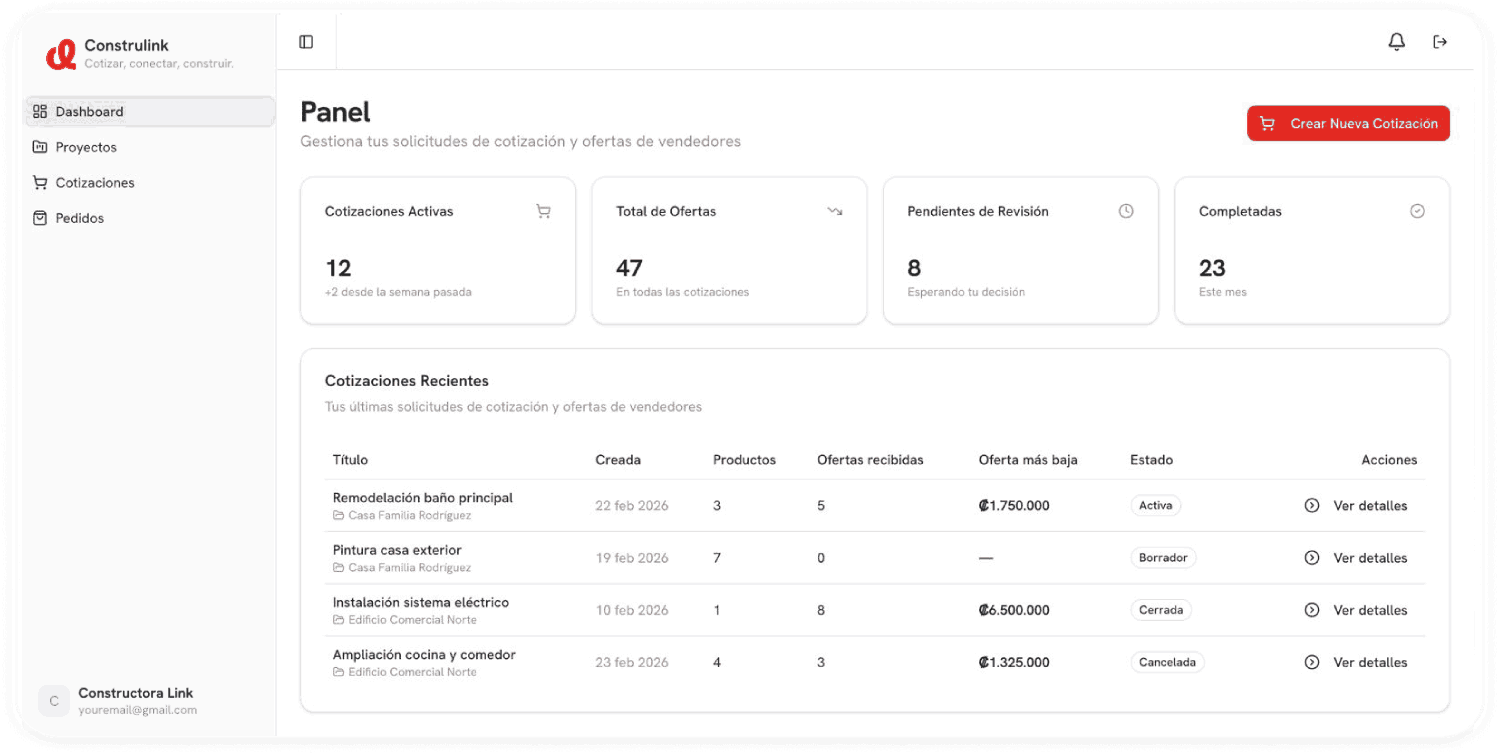 Construlink conecta compradores y vendedores de materiales de construcción con cotizaciones instantáneas y entrega coordinada.